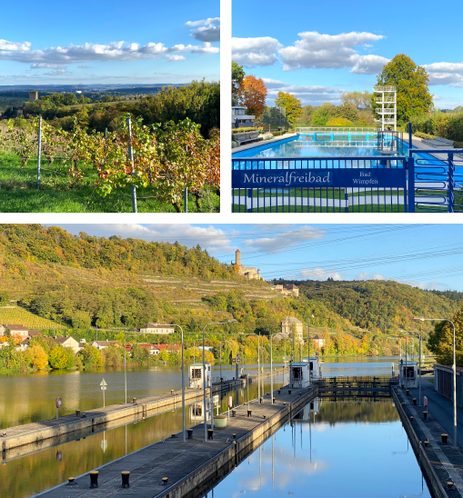 Nach einer Stärkung geht es an Bad Wimpfen, dem Neubau der Lidl Zentrale vorbei nach Hohenstadt und weiter zur Burg Guttenberg. Hinunter nach Neckarmühlbach führt der Radweg in Richtung Hassmersheim am Neckar entlang. Über die Neckarschleuse in Neckarzimmern führt unsere Tour hinauf zu den Feldern oberhalb des Baugebiets Waldsteige West bis in die Altstadt von Mosbach.